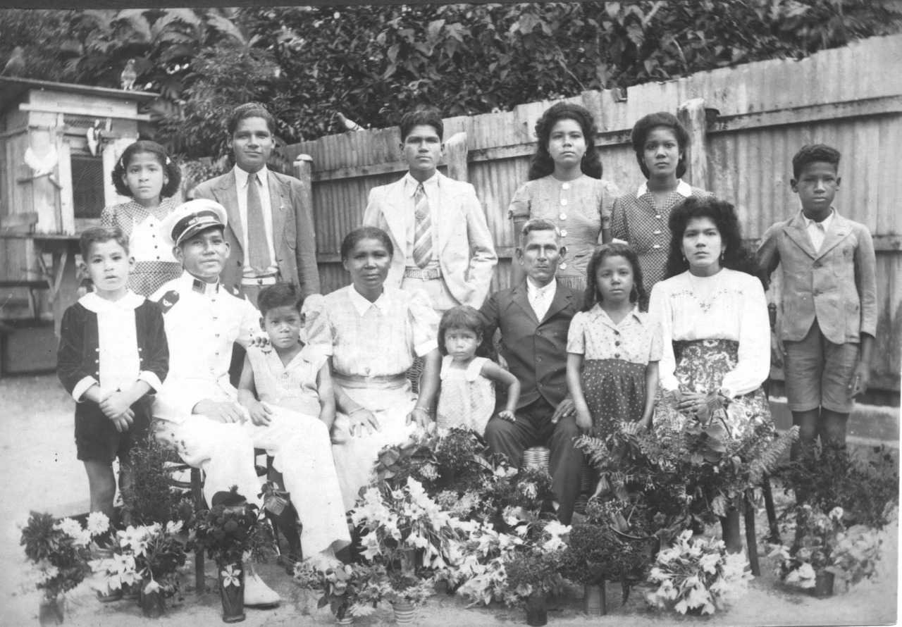 A photo of my grandmother (wearing a white blouse, on the right side) on my mother's side of the family with her half Chinese , half Portuguees Jewish father and her half black, half Native Indian mother and her siblings. Interestingly, she looks more Chinese than her father who is half Chinese. Due to the diverse influences of the parents, many of the siblings look completely different showing their diverse backgrounds.